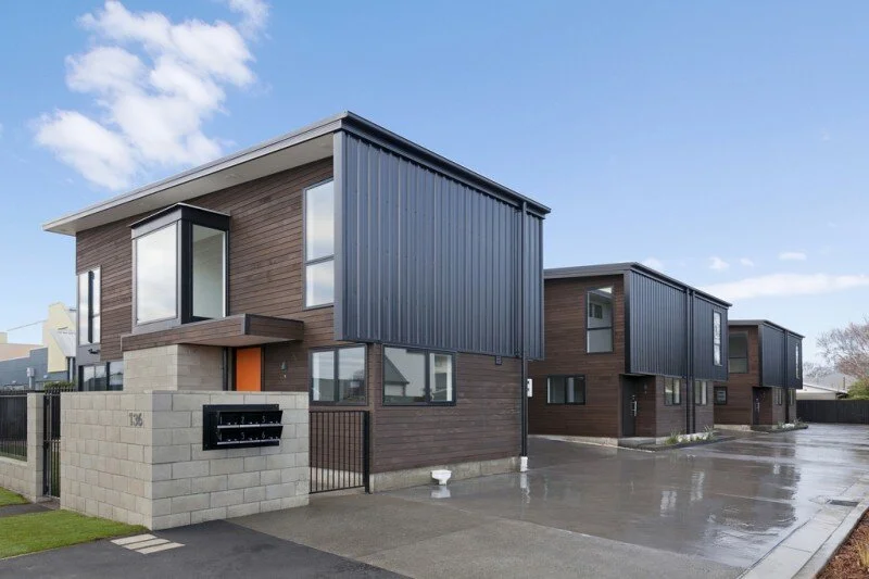 Three bedrooms, three bathrooms and plenty of space for effortless entertaining – you can have it all in the heart of Christchurch. This modern and manageable 192sqm living space forms one half of a well-designed two-unit dwelling development. Cladding of plaster panel is fresh and light beneath pitched heritage tray roofing. Red aluminium composite panels provide a nice surprise, outlining the alfresco entertaining area with a burst of brightness. It’s a lovely spot to unwind in at the end of the day or to gather with friends at the weekend.