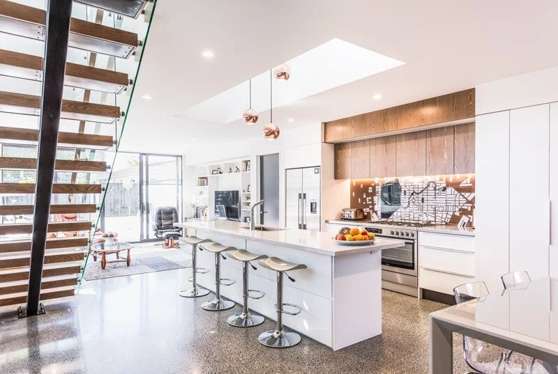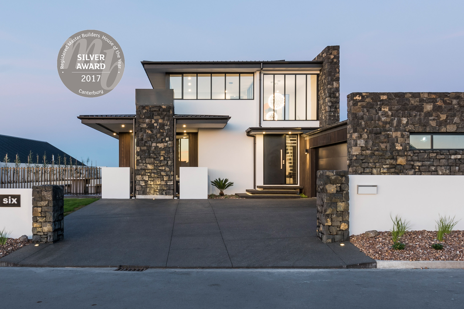 This ultra-modern Christchurch home brings together a combination of contemporary claddings to create striking street appeal. Plaster panel, cedar and stone have the two storeys covered, framing masses of glass. Set high above the city, this house is designed to enjoy great sea views throughout the day. At night, the twinkling lights of the city are a stunning backdrop to elegant entertaining in the open-plan area. An expansive stairwell leads to a mezzanine floor overlooking the dining area. The feeling of open space is incredible under the soaring double-height ceiling.