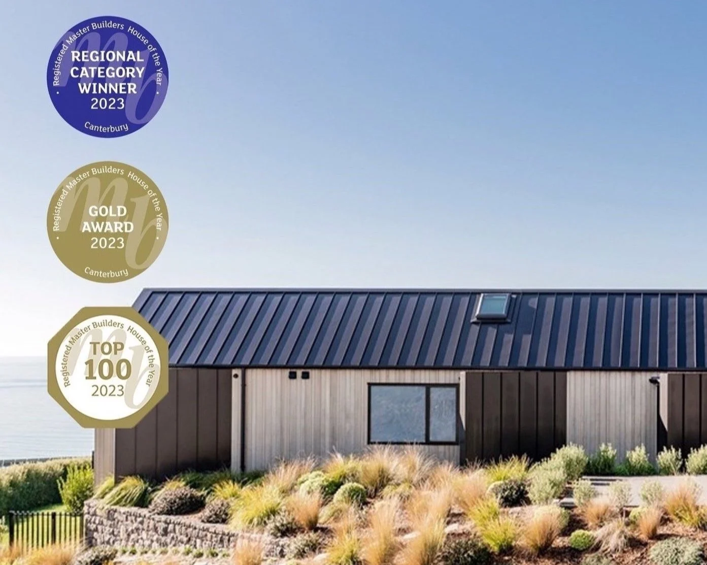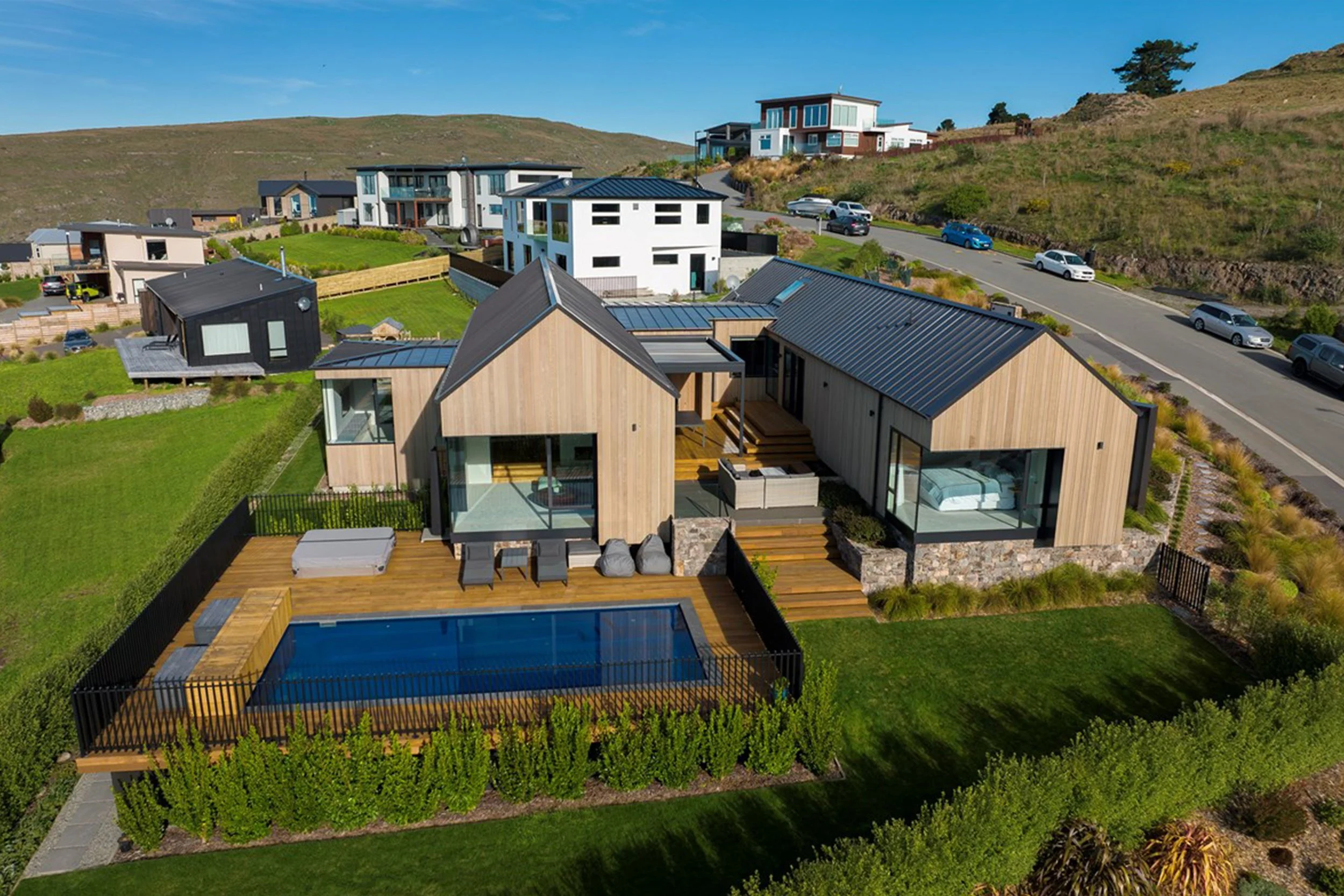At 307sqm, this family home at the top of Richmond Hill in Sumner has an amplitude of living options, and spectacular views. The subtle ribbed lines of the metal cladding contrast with the cedar add depth, shadow and interest to the exterior appearance. With four bedrooms, three bathrooms and two living rooms beneath two gable-roofed wings, the architecturally designed home is divided into two sections, connected by a walkway sitting in between. Along with captivating views of the Canterbury coastline, other luxurious features include a high-end kitchen that merges with the dining-living area, and the grand barn doors.